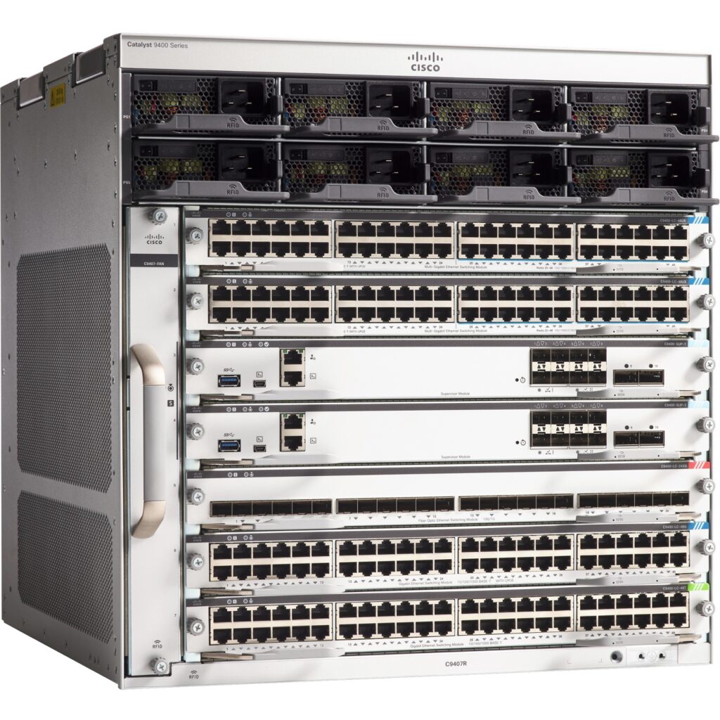 C9407R CISCO CHASSIS PARA SWITCH CATALYST 9400 7 SLOTS GIGABYTE ETHERNET ALTURA 442,2MM LARGURA 439,4 MM PROFUNDIDADE 414MM PESO APROXIMADO 28,58Kg C9407R